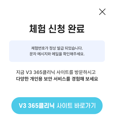 체험신청완료 체험번호가 정상 발급 되었습니다. 문자 메시지와 메일을 확인해주세요.지금 V3 365클리닉 사이트를 방문하시고 다양한 개인용 보안 서비스를 경험해 보세요.
