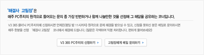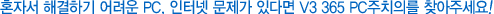 이번 내용은 혼자서 따라하기가 좀 어려우실 수도 있겠는데요, 이럴 경우에는 주저하지 마시고 V3 365 PC 주치의의 원격 지원 서비스를 이용해 보시기 바랍니다.
