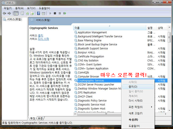 ③ Cryptographic Services를 마우스 오른쪽 단추로 누른 다음 속성을 누릅니다.