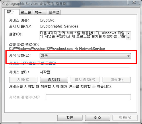 1. Cryptographic Services를 자동으로 설정 합니다.