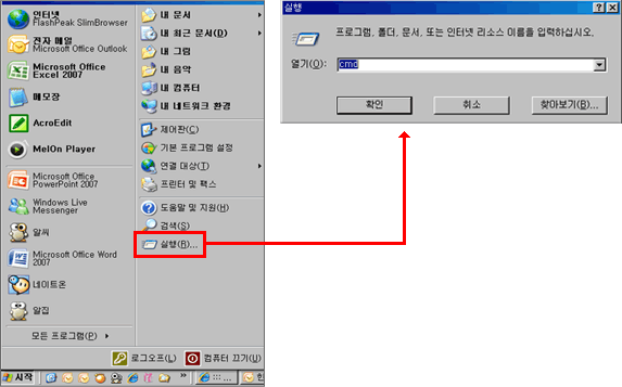 ① 윈도우 하단의 트레이에 있는 [ 시작 ]버튼을 클릭하고 차례로 [ 실행 ] 메뉴를 선택하면 입력창이 뜹니다. 여기에 'cmd' 라고 입력한 다음 확인을 누릅니다. (2번 해결 방법 참조)