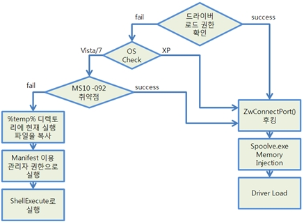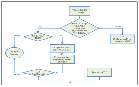 TDL4 드로퍼(Dropper)는 각각 전혀 다른 바이너리를 가진 Custom Packer로 돼 있다. 해당 Packer를 분석하면 실제 코드가 나오는데, 감염 시스템의 OS 버전을 체크한다. 윈도우 비스타나 윈도우 7에서 관리자 권한을 얻기 위해 MS10-092 취약점을 이용한다.