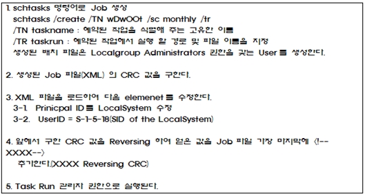 LocalSystem의 권한으로 등록된 실행 파일이 실행된다. 변경된 Job 환경 파일에 아래와 같은 이상한 문자열이 등록되는데, 이것은 reversing한 CRC 값이 추가된 것이다.