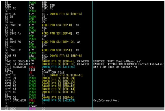 NtLoadDriver()를 이용하여 TDL4 드라이버를 설치 및 후킹 등의 작업을 마친 뒤, 다시 Spoolsv.exe에서 인젝션된 코드로 돌아온다.