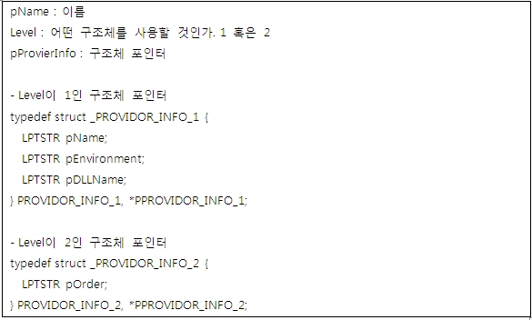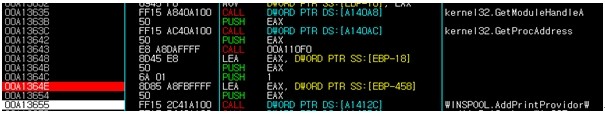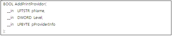 TDL4 드로퍼는 메모리를 할당하고 자신의 DLL 이미지를 복사한다. 해당 DLL를 로드하기 위해 AddPrintProvidor()를 실행해 Sploove.exe에 인젝션한다. 해당 API는 아래와 같다.