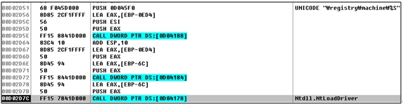 Sploove.exe에 인젝션된 코드는 실제 TDL4 감염 기능을 수행한다. 일단 %TEMP% 디렉터리에 TDL4 드라이버를 드롭한 후, NtLoadDriver() API를 이용해 해당 드라이버를 로드한다.