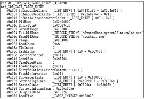로드 역할을 수행하기 위해 ntoskrnl.exe의 Image Address를 얻어오는데, LDR_DATA_TABLE_ENTRY의 링크드 리스트를 이용해 BaseDllName과 이름을 비교한다.