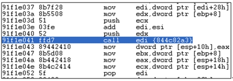 또한 하나의 다른 메모리 영역을 생성하는데, 이것은 LoadLibraryExA(), GetProcAddress(), VirtualFree() API 주소를 저장하며, 해당 API를 호출하는 코드를 복사한다.