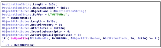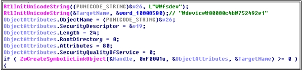 유저 모드로 돌아온 TDL4은 ZwOpenSymbolicLinkObject()라는 API를 실행하는데, 앞서 드라이버에서 생성한 SymbolicLink를 이용한다.