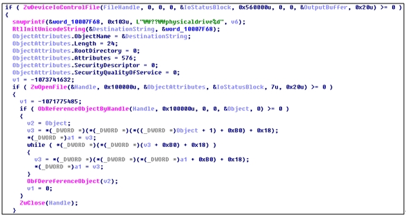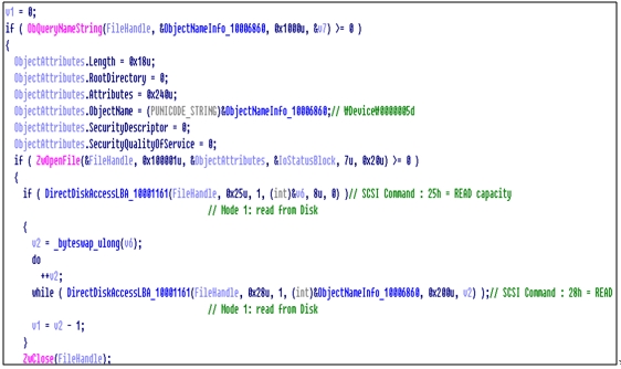 하지만 TDL4는 아주 간단하게 ZwDeviceIoControlFile()를 호출해 언파티션드 영역의 위치를 얻어온다.