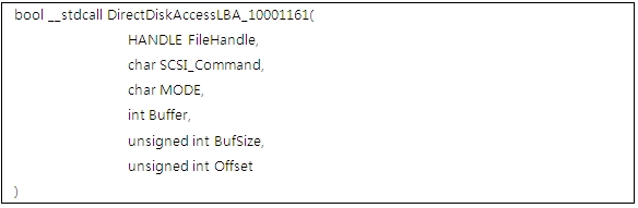 [그림 20]에서 두번째 DirectDiskAccessLBA 함수의 파라미터 중 Mode가 0x28이다. 0x28은 SCSI Read Commands로 LBA 위치를 크기만큼 읽어 버퍼에 저장할 수 있다.