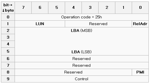 위키피디아를 참조하면, 0x25는 SCSI Read Capacity Command로 설명돼 있다. 타깃 디바이스의 데이터 용량의 정보를 알 수 있다. 아래는 CDB(Command Descriptor Block) 구조이다.