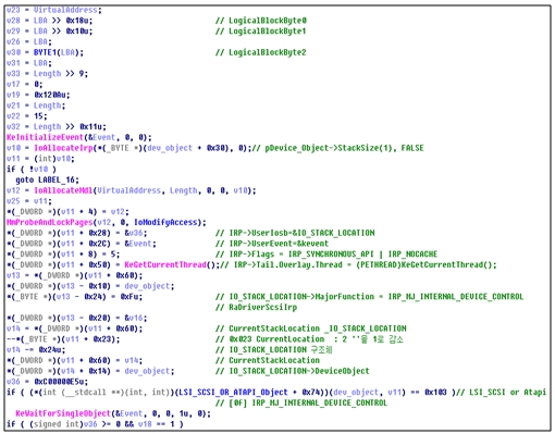 [그림 20]에서 첫번째 DirectDiskAccessLBA 함수 중 SCSI_Command가 0x25인 걸 알 수 있다. SCSI Read Capacity Command(0x25)를 이용해, 하드 드라이브의 마지막 크기를 알아내고, 다음 섹터부터 언파티션드 영역이라 생각하고, 한 섹터씩 반복해서 읽어본다. 그러다 에러 코드를 보내주면 언파티션드의 가장 마지막이라 생각한다.