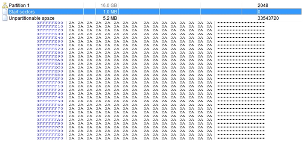 이렇게 구해진 디스크의 마지막 섹터부터 1섹터씩 읽어가며, 에러를 리턴할 때까지 지속해서 읽어본다. 에러 리턴하는 섹터의 바로 전 섹터가 언파티션드 영역의 마지막 섹터인 걸 알 수 있다.