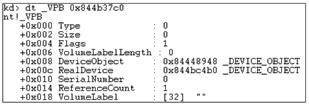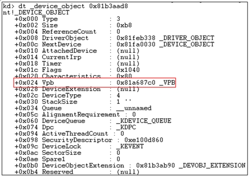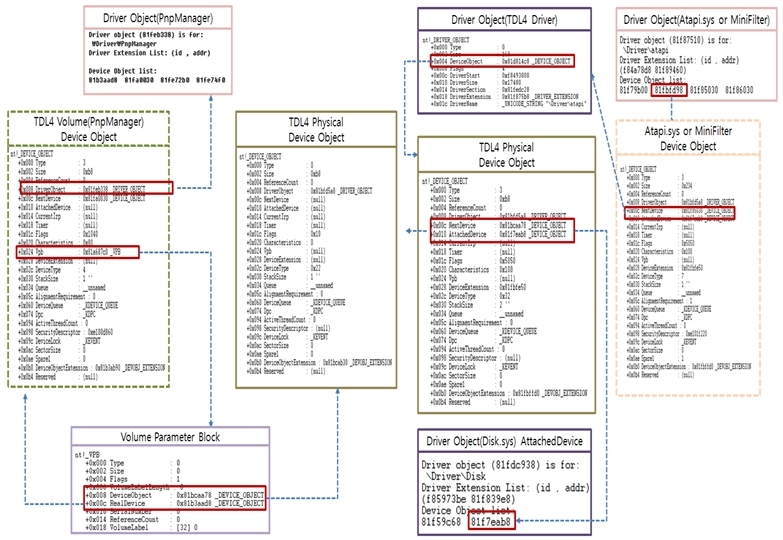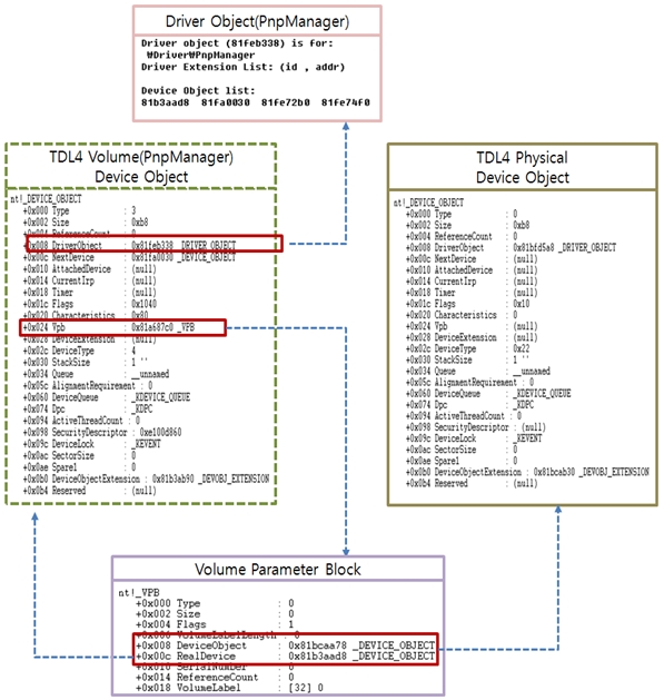 VPB 구조체 중 Device Object 필드가 TDL4 드라이버가 가지고 있는 Device Object를 가리킨다. VPB(Volume Parameter Block)는 마운트된 볼륨을 나타내는 파일 시스템 드라이버의 Device Object로 파일 시스템의 데이터 구조를 포함하는 물리 디스크나 가상 디스크를 나타내는 디바이스 오브젝트 사이의 연결을 나타낸 것이다.