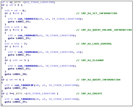 위와 같은 설정된 TDL4 Driver Object는 유저 모드에서 언파티션 영역으로 접근할 때 사용된다. 또한 Atapi.sys의 StartIo를 자신의 코드로 변경하여 후킹한다. 각 MajorFunction은 아래와 같이 분기된다.