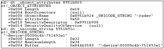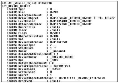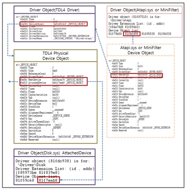 또한 TDL4 드라이버에 의해 생성된 Device Object의 AttachedDevice는 Disk.sys의 Device Object를 가리킨다.