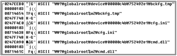 TDL4는 이제 언파티션드 영역에 자신의 모듈을 저장한다. 앞서 드라이버에서는 악성 MBR 감염, 정상 MBR 백업, cfg.ini을 저장했고, 나머지 모듈을 유저 모드에서 저장한다.