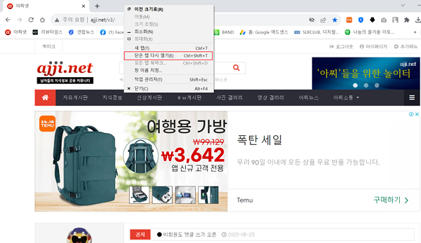 인터넷 브라우저를 탐색하다가 윈도우 창을 무심코 닫았는데, 이를 다시 복구하고 싶을 때가 있을 것이다. 이 경우, ‘닫은 탭 다시 열기’를 하면 된다. 브라우저에서 열린 탭에 커서를 두고 마우스 오른쪽 버튼을 클릭하면 메뉴 창이 뜨는데, 여기서 ‘닫은 탭 다시 열기’ 항목을 선택하면 된다. 또는 단축키 ‘Ctrl+Shift+T’를 사용해도 무방하다. 이 기능은 어떤 검색어로 나온 창인지 기억나지 않을 때 유용하며, 구글 크롬이나 네이버 웨일, 익스플로러 등 대부분의 브라우저에서 지원한다.