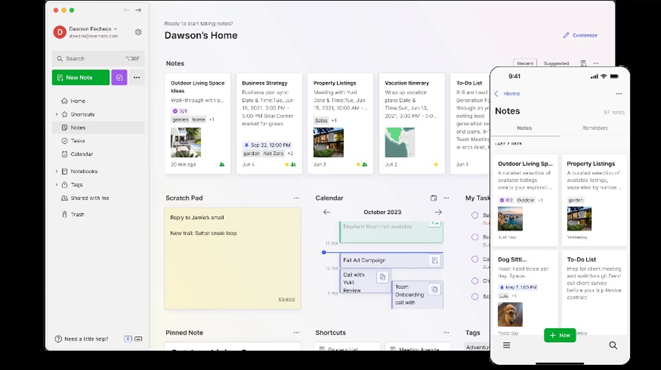 에버노트(Evernote)는 웹 클리퍼(Web Clipper)를 통해 웹 페이지 저장이 가능하며, 손글씨 메모와 그림 그리기 기능을 지원한다. 메모 검색 및 태그 기능을 지원하고, 다양한 기기에서 메모를 동기화할 수 있다. 에버노트는 유료 요금제를 기반으로 하고 있어 기본 무료 기능 외에 용량 확장을 위해서는 유료 요금제를 이용해야 한다. 가격도 꽤 높은 편이다.